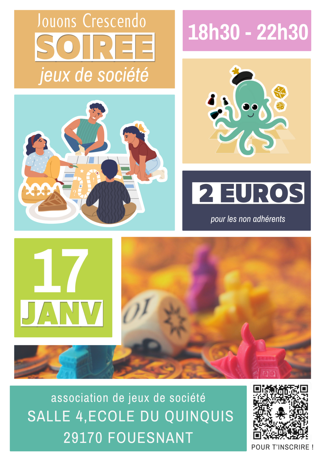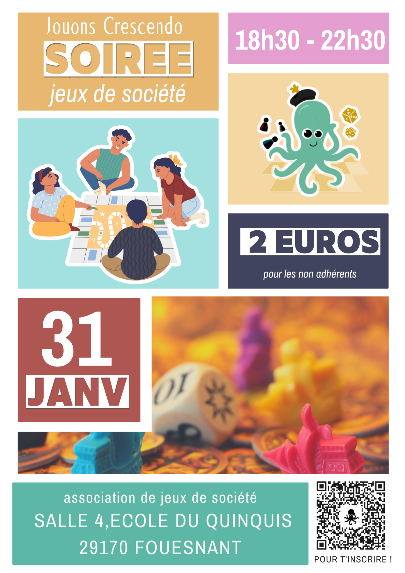 Nos soirées se déroulent dans la salle 6 ou 4 de l'école du Quinquis, située sur le chemin du Quinquis à Fouesnant (route menant à Beg Meil).